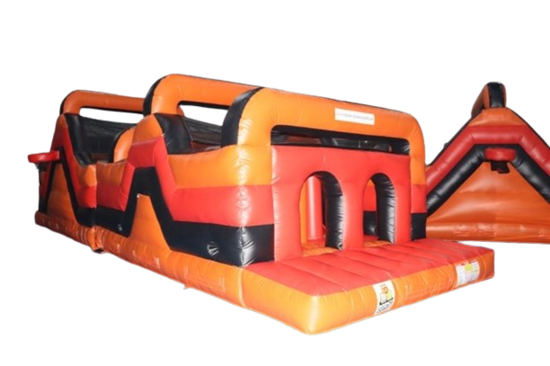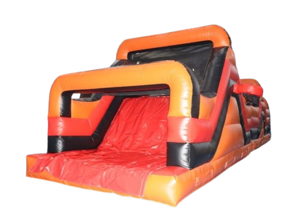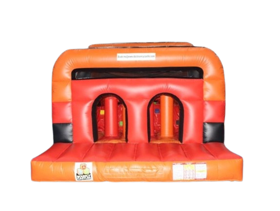 This inflatable is a two part unit that consists of a series of obstacles that can be climbed over or under. It also includes a climbing wall and the ever popular 8ft slide at the end of the obstacle course. On the outside, there are two basketball hoops.