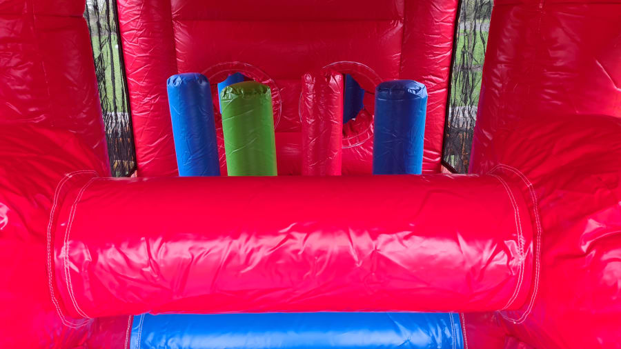 This massive Obstacle Course has two slides, a rock climbing wall, a bish and bash area and bouncy areas within. It is fully covered with safety netting to each side for ease of monitoring and supervision.This inflatable is perfect for birthday parties, communions, confirmations, school days, sports days and festivals. Our obstacle courses come in all shapes, sizes and colours and they are suitable for kids of all ages.